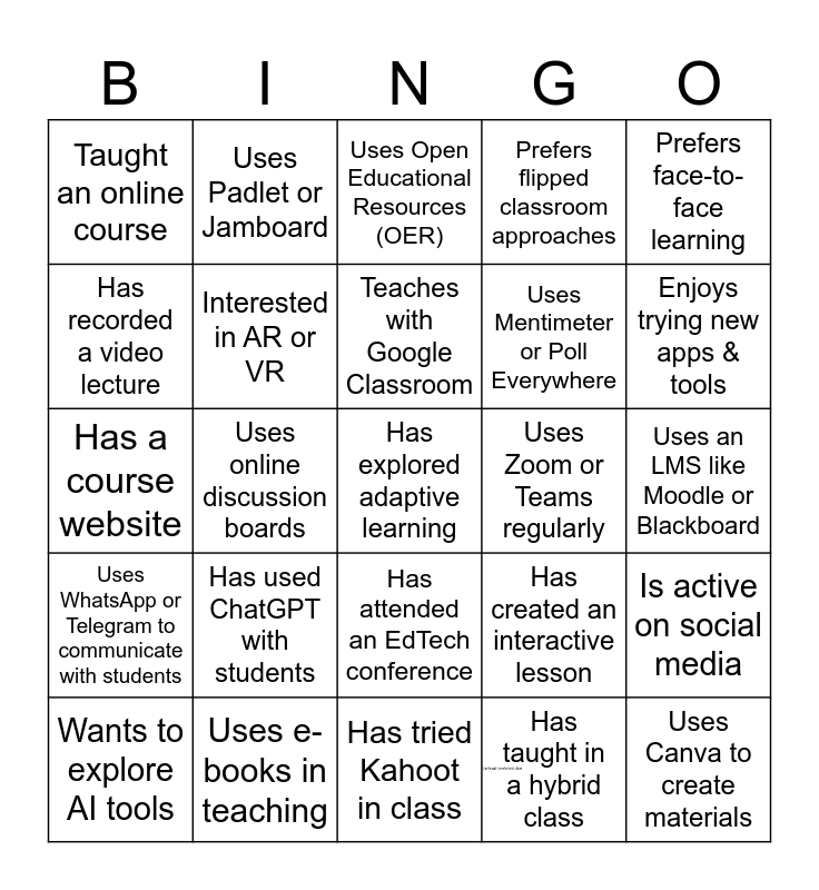 This bingo card has 1 images and 25 words: Has used ChatGPT with students, Has tried Kahoot in class, Teaches with Google Classroom, Wants to explore AI tools, Prefers face-to-face learning, Taught an online course, Has recorded a video lecture, Uses Padlet or Jamboard, Uses Zoom or Teams regularly, Has attended an EdTech conference, Uses Mentimeter or Poll Everywhere, Has a course website, Has created an interactive lesson, Is active on social media, Interested in AR or VR, Uses Canva to create materials, Uses an LMS like Moodle or Blackboard, Uses Open Educational Resources (OER), Enjoys trying new apps & tools, Uses online discussion boards, Has explored adaptive learning, Uses e-books in teaching, Uses WhatsApp or Telegram to communicate with students, Prefers flipped classroom approaches and Has taught in a hybrid class.