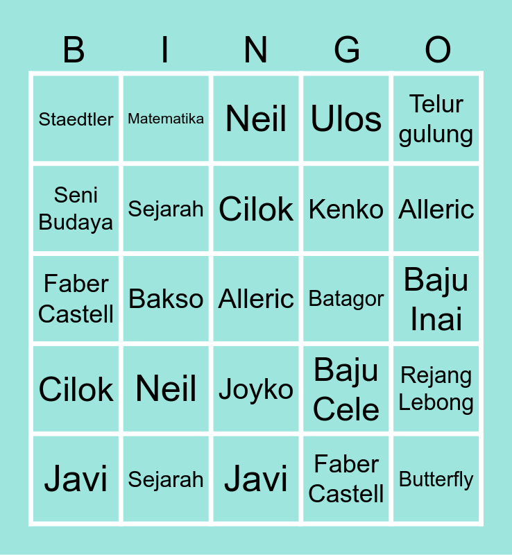 ⚠ This card has duplicate items: Alleric (2), Valentine (2), Javi (2), Neil (2), Suvencio (2), Matematika (2), Bhs Inggris (2), Seni Budaya (2), Fisika (2), Sejarah (2), Ulos (2), Rejang Lebong (2), Baju Cele (2), Aesan Gede (2), Baju Inai (2), Cilok (2), Batagor (2), Cireng (2), Telur gulung (2), Bakso (2), Faber Castell (2), Staedtler (2), Kenko (2), Joyko (2), Butterfly (2)