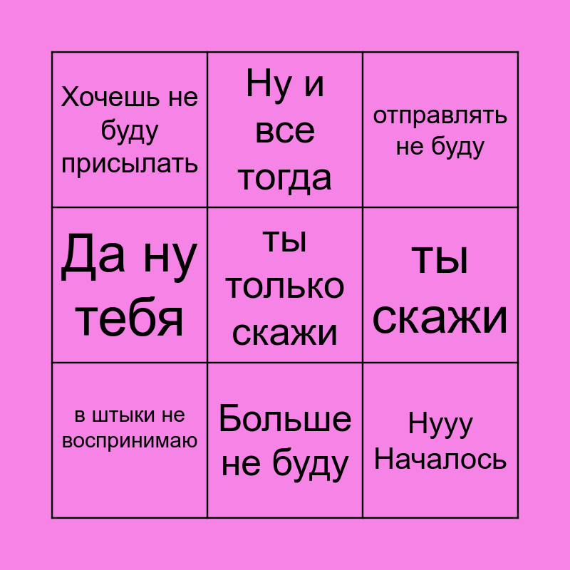 This bingo card has a free space and 8 words: ты скажи, отправлять не буду, Ну и все тогда, в штыки не воспринимаю, Хочешь не буду присылать, Нууу Началось, Да ну тебя and Больше не буду.