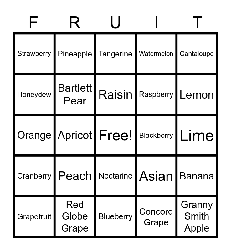 This bingo card has a free space and 29 words: Grapefruit, Red Delicious Apple, Apricot, Plum, Strawberry, Tangerine, Bartlett Pear, Peach, Blackberry, Red Globe Grape, Lime, Granny Smith Apple, Blueberry, Concord Grape, Lemon, Jonagold Apple, Nectarine, Cranberry, Cantaloupe, Orange, Asian, Cherry, Raspberry, Honeydew, Watermelon, Pineapple, Banana, Raisin and Prune.