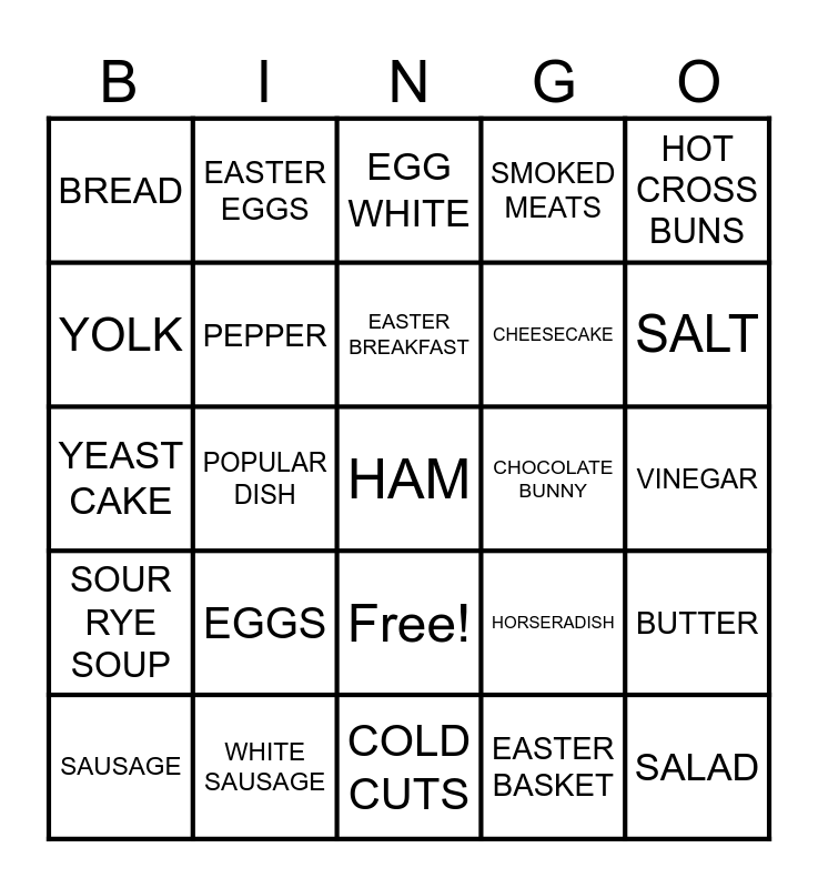 This bingo card has 26 words: Free!, SAUSAGE, PEPPER, SUNDAY ROAST, SMOKED MEATS, HOT CROSS BUNS, YOLK, EASTER EGGS, EASTER BREAKFAST, EASTER BASKET, SALT, YEAST CAKE, WHITE SAUSAGE, COLD CUTS, CHOCOLATE BUNNY, SALAD, BREAD, EGGS, EGG WHITE, HORSERADISH, VINEGAR, SOUR RYE SOUP, POPULAR DISH, HAM, CHEESECAKE and BUTTER.