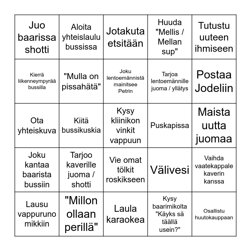 This bingo card has 25 words: Tarjoo kaverille juoma / shotti, Laula karaokea, Joku lentoemännistä mainitsee Petrin, Lausu vappuruno mikkiin, Tutustu uuteen ihmiseen, Juo baarissa shotti, Kierrä liikenneympyrää bussilla, Aloita yhteislaulu bussissa, Puskapissa, Vie omat tölkit roskikseen, Tarjoa lentoemännille juoma / yllätys, Ota yhteiskuva, Välivesi, Vaihda vaatekappale kaverin kanssa, "Mulla on pissahätä", Osallistu huutokauppaan, Maista uutta juomaa, Jotakuta etsitään, Postaa Jodeliin, Kiitä bussikuskia, Kysy kliinikon vinkit vappuun, "Millon ollaan perillä", Joku kantaa baarista bussiin, Huuda "Mellis / Mellan sup" and Kysy baarimikolta "Käyks sä täällä usein?".