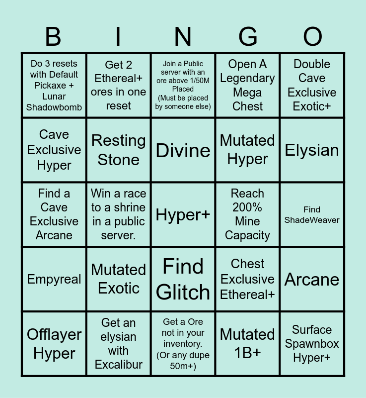 This bingo card has a free space and 24 words: Mutated Exotic, Get an elysian with Excalibur, Divine, Offlayer Hyper, Double Cave Exclusive Exotic+, Do 3 resets with Default Pickaxe + Lunar Shadowbomb, Cave Exclusive Hyper, Get 2 Ethereal+ ores in one reset, Reach 200% Mine Capacity, Find Glitch, Mutated Hyper, Find a Cave Exclusive Arcane, Chest Exclusive Ethereal+, Arcane, Resting Stone, Mutated 1B+, Find ShadeWeaver, Join a Public server with an ore above 1/50M Placed (Must be placed by someone else), Elysian, Win a race to a shrine in a public server., Surface Spawnbox Hyper+, Empyreal, Open A Legendary Mega Chest and Get a Ore not in your inventory. (Or any dupe 50m+).