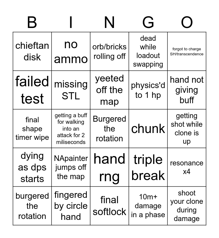 This bingo card has a free space and 24 words: NApainter jumps off the map, fingered by circle hand, yeeted off the map, burgered the rotation, forgot to charge SH/transcendence, chieftan disk, failed test, no ammo, chunk, hand rng, physics'd to 1 hp, final shape timer wipe, triple break, resonance x4, missing STL, 10m+ damage in a phase, getting shot while clone is up, orb/bricks rolling off, hand not giving buff, getting a buff for walking into an attack for 2 miliseconds, shoot your clone during damage, dying as dps starts, dead while loadout swapping and final softlock.