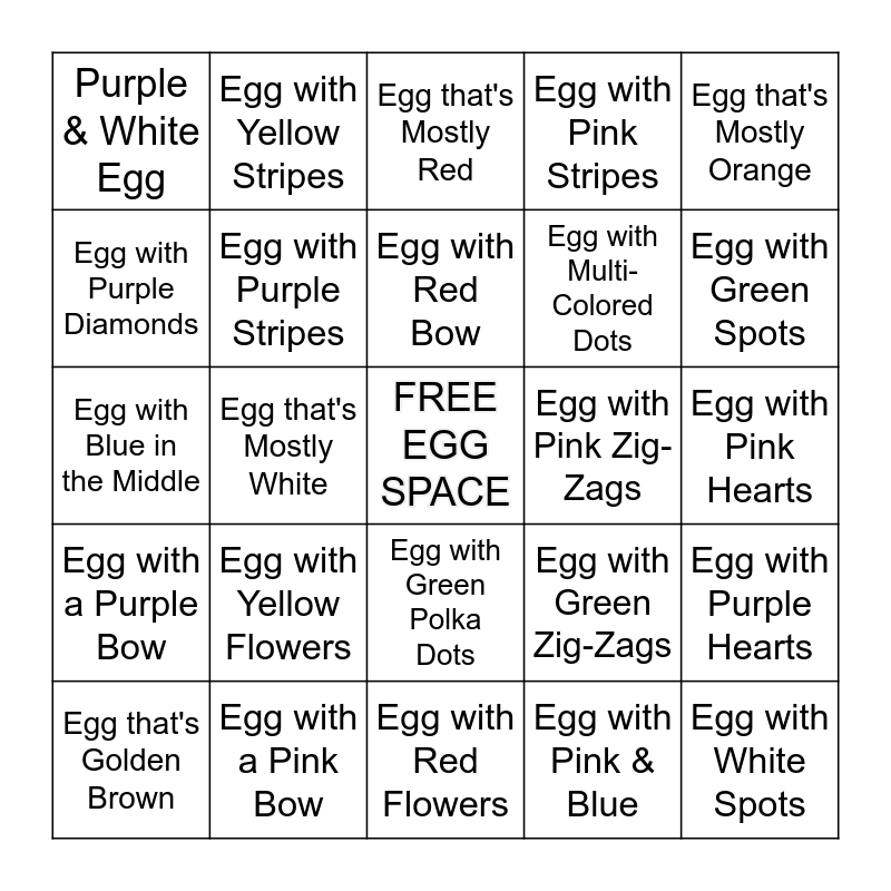 This bingo card has a free space and 29 words: Egg that's Golden Brown, Egg with Blue Stripes, Egg that's Mostly White, Egg with Blue Polka Dots, Purple & White Egg, Egg that's Mostly Red, Egg with Purple Stripes, Egg with Yellow Flowers, Egg with Pink Zig-Zags, Egg with a Pink Bow, Egg with Pink Hearts, Egg with White Spots, Egg with Red Flowers, Egg with Pink & Blue, Egg with Green Spots, Egg with Blue Stars, Egg with Green Polka Dots, Egg with a Purple Bow, Egg that's Mostly Orange, Egg with Blue in the Middle, Egg with Green Zig-Zags, Egg with Rainbow Stripes, Egg with Multi-Colored Dots, Egg with Purple Diamonds, Egg with Pink Stripes, Egg with Yellow Stripes, Egg with Purple Hearts, Egg with Red Bow and Egg with Orange & Blue.