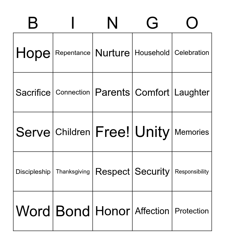 This bingo card has a free space and 24 words: Word, Thanksgiving, Parents, Affection, Celebration, Hope, Repentance, Nurture, Unity, Memories, Serve, Connection, Security, Responsibility, Sacrifice, Bond, Honor, Household, Laughter, Discipleship, Children, Respect, Comfort and Protection.