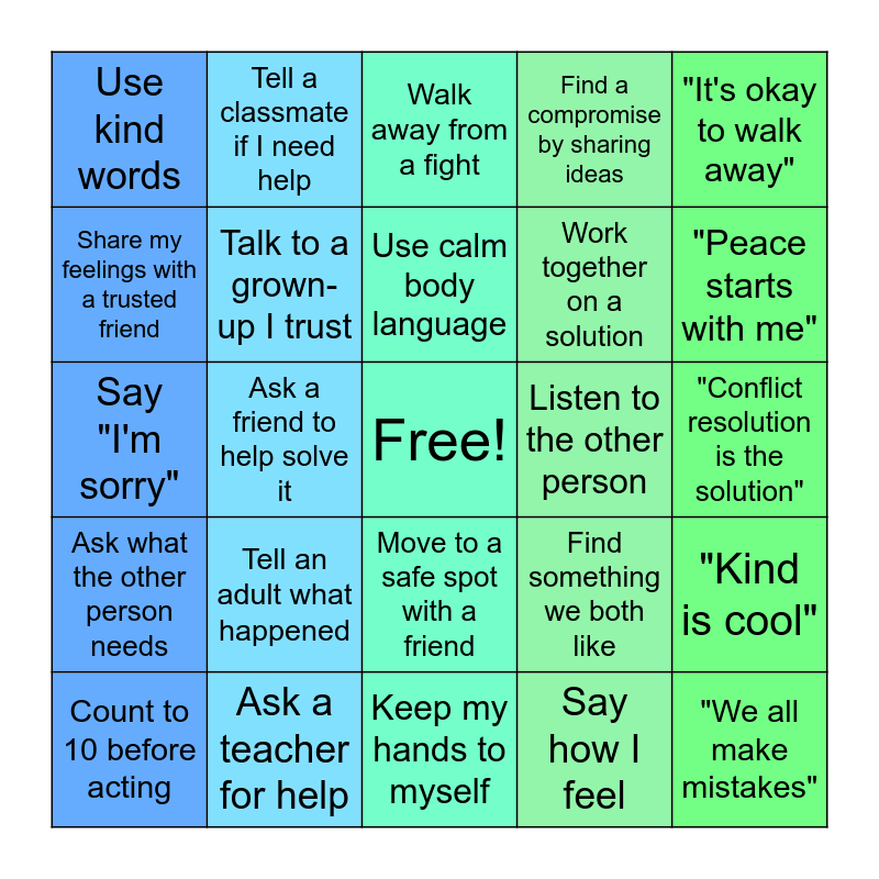 This bingo card has a free space and 29 words: Take a deep breath, Ask a teacher for help, Walk away from a fight, Take turns talking, "It's okay to walk away", Use kind words, Talk to a grown-up I trust, Use calm body language, Listen to the other person, "Kind is cool", Count to 10 before acting, Ask a friend to help solve it, Say how I feel, "We all make mistakes", Say "I'm sorry", Find a quiet space, Keep my hands to myself, Find something we both like, "Peace starts with me", Ask what the other person needs, Tell an adult what happened, Talk it out calmly, Work together on a solution, "Conflict resolution is the solution", Share my feelings with a trusted friend, Tell a classmate if I need help, Move to a safe spot with a friend, Find a compromise by sharing ideas and "I don't have to fight".