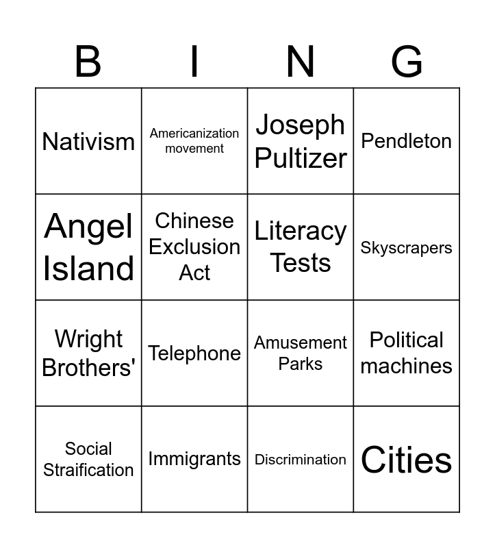 This bingo card has 16 words: Immigrants, Political machines, Joseph Pultizer, Nativism, Wright Brothers', Americanization movement, Amusement Parks, Discrimination, Angel Island, Chinese Exclusion Act, Social Straification, Pendleton, Telephone, Skyscrapers, Literacy Tests and Cities.