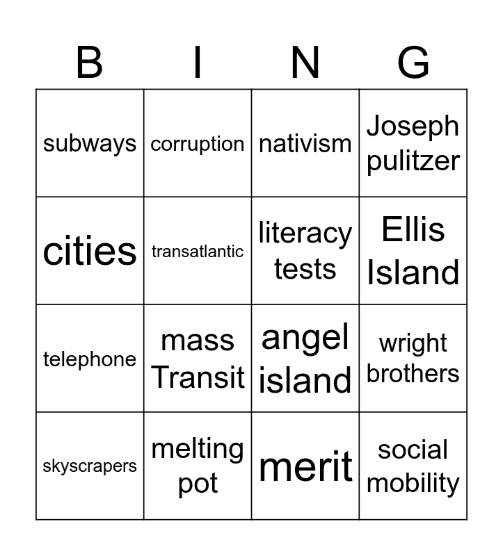 This bingo card has 16 words: melting pot, wright brothers, nativism, subways, telephone, corruption, angel island, merit, cities, transatlantic, skyscrapers, Joseph pulitzer, mass Transit, Ellis Island, literacy tests and social mobility.