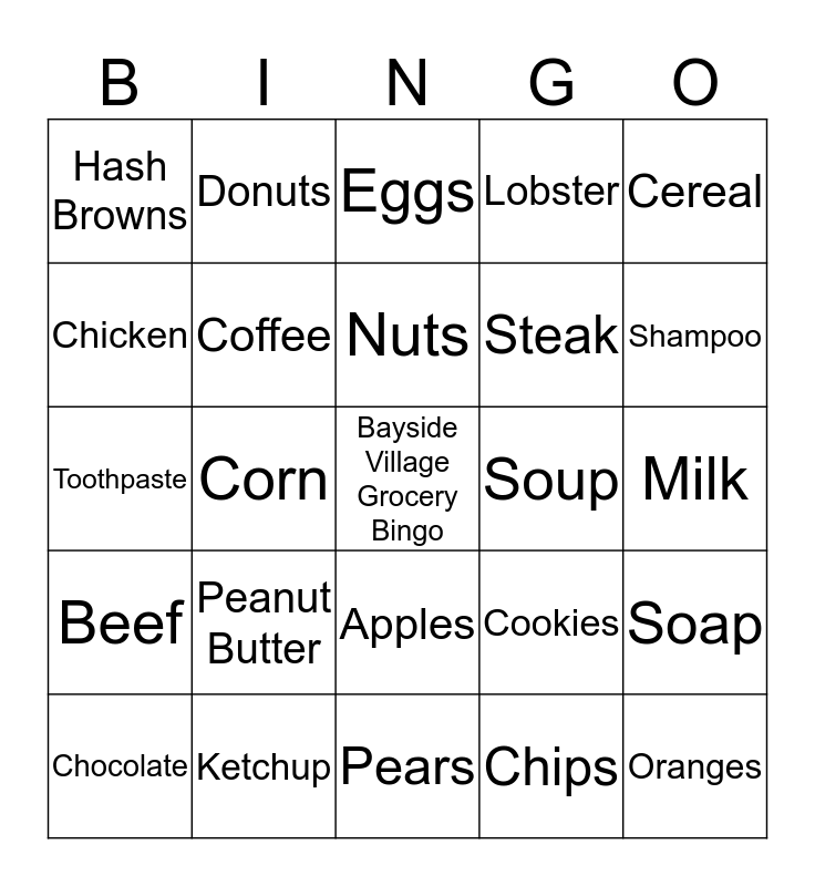 This bingo card has a free space and 30 words: Ketchup, Paper Towels, Corn, Bread, Hash Browns, Eggs, Coffee, Apples, Soup, Pears, Milk, Oranges, Chips, Tofu, Shampoo, Pasta, Cookies, Beef, Peanut Butter, Cereal, Toothpaste, Cheese, Donuts, Steak, Chicken, Lobster, Soap, Chocolate, Nuts and Wine.