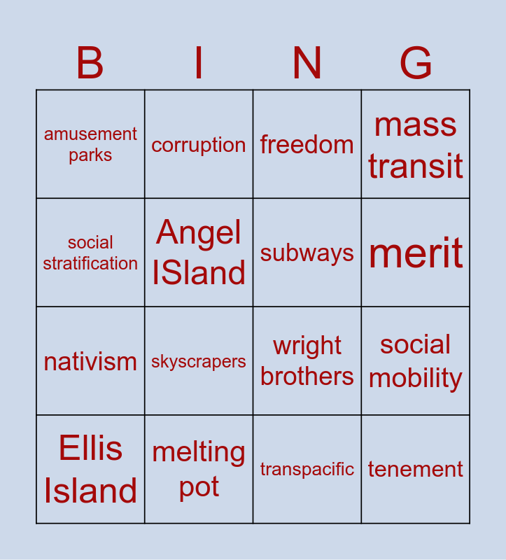 This bingo card has 16 words: melting pot, social mobility, freedom, amusement parks, nativism, corruption, wright brothers, transpacific, social stratification, Angel ISland, Ellis Island, mass transit, skyscrapers, merit, subways and tenement.