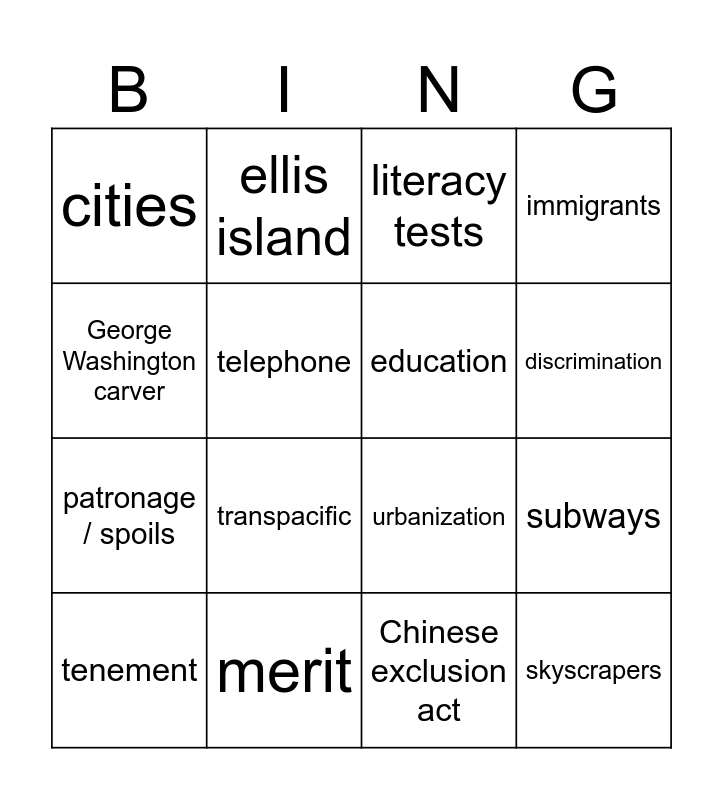 This bingo card has 16 words: merit, subways, literacy tests, cities, patronage / spoils, ellis island, urbanization, Chinese exclusion act, George Washington carver, telephone, tenement, immigrants, transpacific, discrimination, education and skyscrapers.