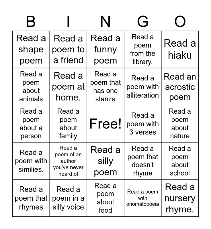 This bingo card has a free space and 24 words: Read a poem of an author you've never heard of, Read a poem in a silly voice, Read a poem that has one stanza, Read a poem that rhymes, Read a hiaku, Read a shape poem, Read a poem about animals, Read a poem to a friend, Read a poem with 3 verses, Read a silly poem, Read a poem with alliteration, Read a poem about a person, Read a poem that doesn't rhyme, Read a poem about school, Read a poem at home., Read a poem with onomatopoeia, Read a poem about nature, Read a funny poem, Read an acrostic poem, Read a poem about family, Read a nursery rhyme., Read a poem with similies., Read a poem from the library. and Read a poem about food.