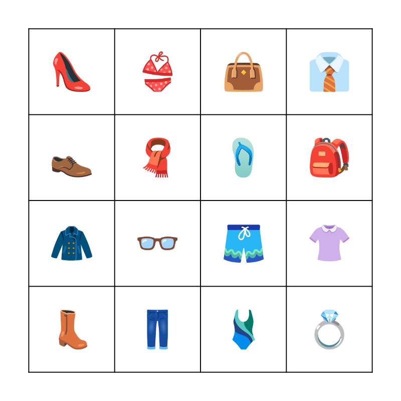 This bingo card has 20 words: ๐, ๐, ๐, ๐, ๐ข, ๐, ๐, ๐ , ๐งฅ, ๐, ๐, ๐ฉณ, ๐งฃ, ๐, ๐ฉด, ๐ถ๏ธ, ๐, ๐, ๐ฉฑ and ๐งค.