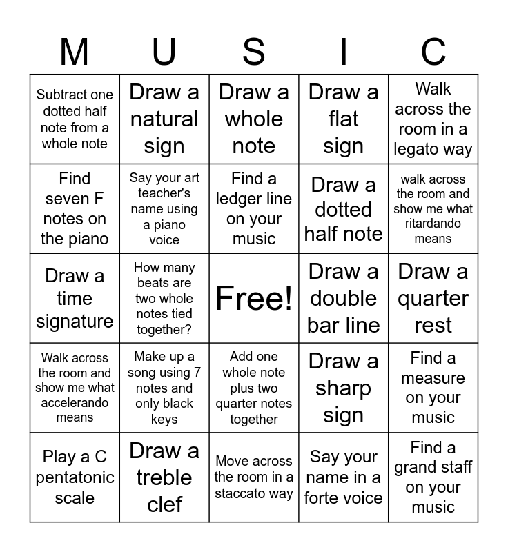 This bingo card has a free space and 29 words: Play a C pentatonic scale, Say the alphabet that has a repeat sign at the end, How many beats are two whole notes tied together?, Draw a quarter note, Subtract one dotted half note from a whole note, Draw a whole note, Say your art teacher's name using a piano voice, Make up a song using 7 notes and only black keys, Draw a double bar line, Draw a treble clef, Draw a quarter rest, Find a grand staff on your music, Move across the room in a staccato way, Say your name in a forte voice, walk across the room and show me what ritardando means, Draw a half note, Add one whole note plus two quarter notes together, Walk across the room and show me what accelerando means, Walk across the room in a legato way, Draw a time signature, Draw a sharp sign, Draw a bass clef, Draw a dotted half note, Find seven F notes on the piano, Draw a flat sign, Draw a natural sign, Find a measure on your music, Find a ledger line on your music and Play an 8-beat rhythm pattern using ti-ti and tas.