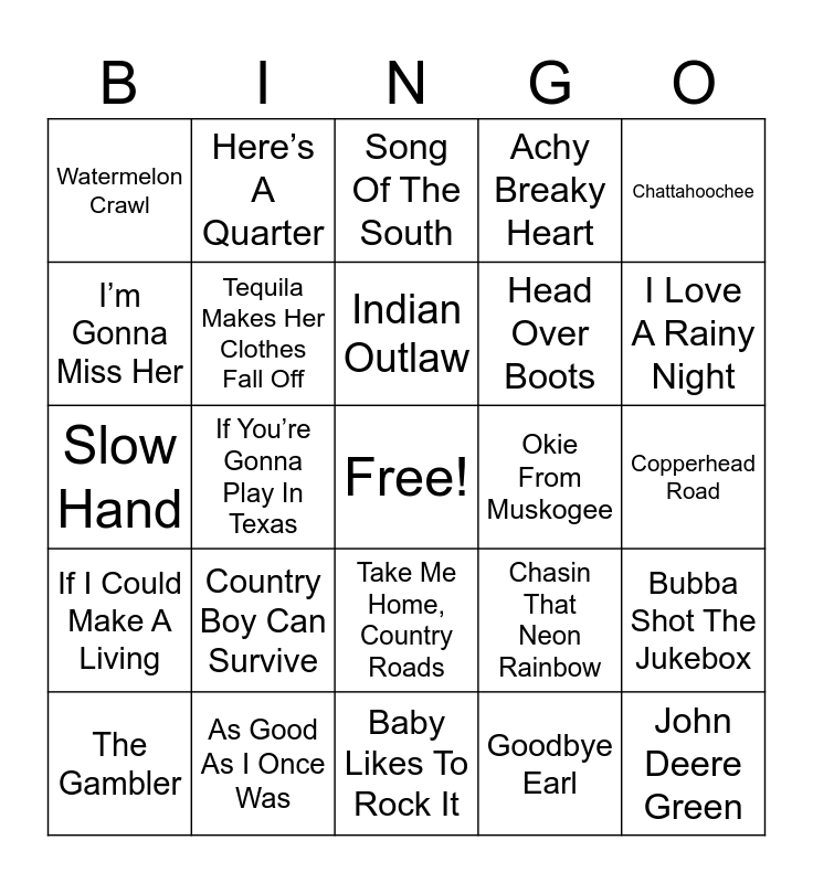 This bingo card has a free space and 77 words: Fishin In The Dark, The Fireman, Song Of The South, Should’ve Been. Cowboy, Prop Me Up Beside The Jukebox, Heads Carolina, Tails California, Ocean Front Property, Some Girls Do, All My Ex’s Live In Texas, Red Dirt Road, She Thinks My Tractors Sexy, Mountain Music, Indian Outlaw, I’m Gonna Miss Her, Dixieland Delight, If You’re Gonna Play In Texas, Ring Of Fire, John Deere Green, I Like It, I Love It, Chattahoochee, Be My Baby Tonight, Slow Hand, Tequila Makes Her Clothes Fall Off, Here’s A Quarter, Achy Breaky Heart, Any Man Of Mine, Chicken Fried, Red Neck Yacht Club, Ol Red, Smoky Mountain Rain, Baby’s Got Her Blue Jeans On, The Race Is On, Save A Horse, Ride A Cowboy, Chasin That Neon Rainbow, I Love A Rainy Night, Head Over Boots, Rock My World, Little Country Girl, Cotton Eyed Joe, Copperhead Road, Goodbye Earl, God Blessed Texas, Islands In The Stream, Sold, Walkin After Midnight, Kiss This, Mommas Don’t Let Your Babies Grow Up To Be Cowboys, The Gambler, Watermelon Crawl, Drinkin My Baby Goodbye, 5-1-5-0, Boot Scootin Boogie, Take Me Home, Country Roads, Drunk On A Plane, What Was I Thinkin, Straight Tequila Night, Swingin, Nothing On But The Radio, Family Tradition, She’s In Love With The Boy, Strawberry Wine, Country Boy Can Survive, XXX’s & OOO’s, Man, I Feel Like A Woman, She Don’t Know She’s Beautiful, Life’s A Dance, Summertime Blues, Workin Man Blues, Okie From Muskogee, T-R-O-U-B-L-E, On The Road Again, Beer For My Horses, Bubba Shot The Jukebox, If I Could Make A Living, As Good As I Once Was, I’m From The Country, Baby Likes To Rock It and It’s A Great Day To Be Alive.
