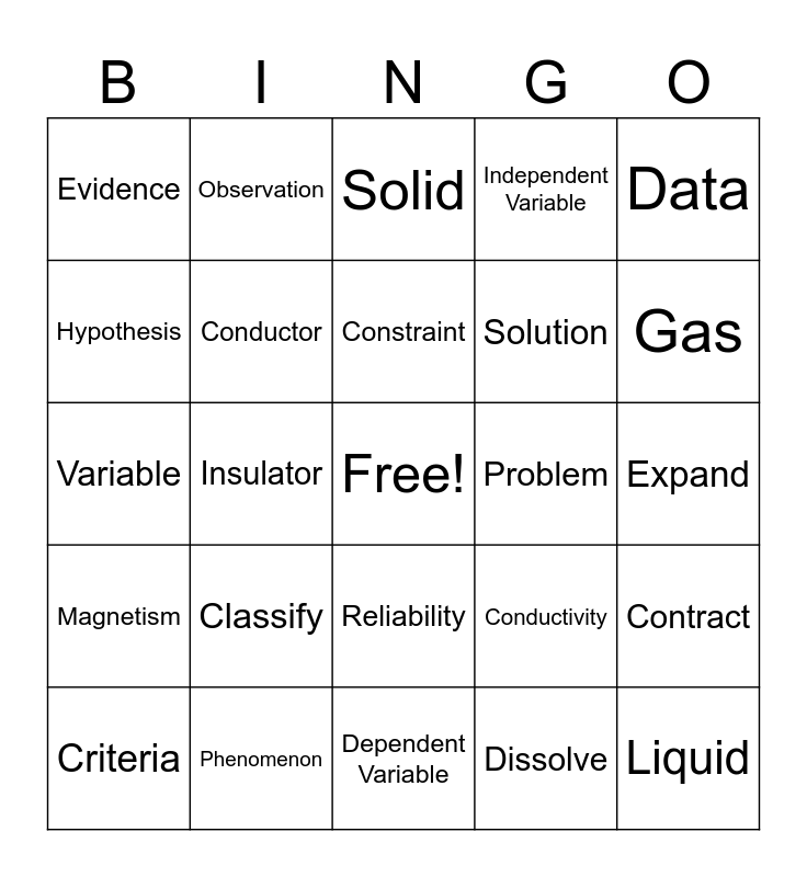 This bingo card has a free space and 24 words: Classify, Phenomenon, Constraint, Criteria, Data, Evidence, Hypothesis, Observation, Problem, Reliability, Solution, Variable, Conductivity, Contract, Conductor, Dissolve, Expand, Solid, Gas, Insulator, Liquid, Magnetism, Independent Variable and Dependent Variable.