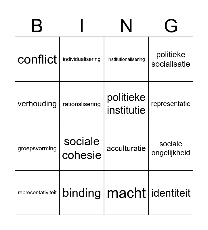 This bingo card has 27 words: democratisering, globalisering, groepsvorming, staatsvorming, rationslisering, institutionalisering, individualisering, identiteit, binding, socialisatie, acculturatie, politieke socialisatie, ideologie, cultuur, sociale cohesie, sociale institutie, politieke institutie, representatie, samenwerking, conflict, macht, gezag, sociale ongelijkheid, representativiteit, vorming, verhouding and verandering.