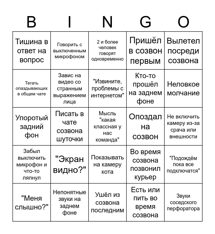 This bingo card has a free space and 24 words: "Экран видно?", Непонятные звуки на заднем фоне, "Извините, проблемы с интернетом", "Меня слышно?", Вылетел посреди созвона, Тишина в ответ на вопрос, Тегать опаздывающих в общем чате, Говорить с выключенным микрофоном, Опоздал на созвон, Показывать на камеру кота, Кто-то прошёл на заднем фоне, Упоротый задний фон, Во время созвона позвонил курьер, "Подождём пока все подключатся", Завис на видео со странным выражением лица, Есть или пить во время созвона, Не включить камеру из-за срача или внешности, 2 и более человек говорят одновременно, Неловкое молчание, Писать в чате созвона шуточки, Звуки соседского перфоратора, Забыл выключить микрофон и что-то ляпнул, Пришёл в созвон первым and Ушёл из созвона последним.