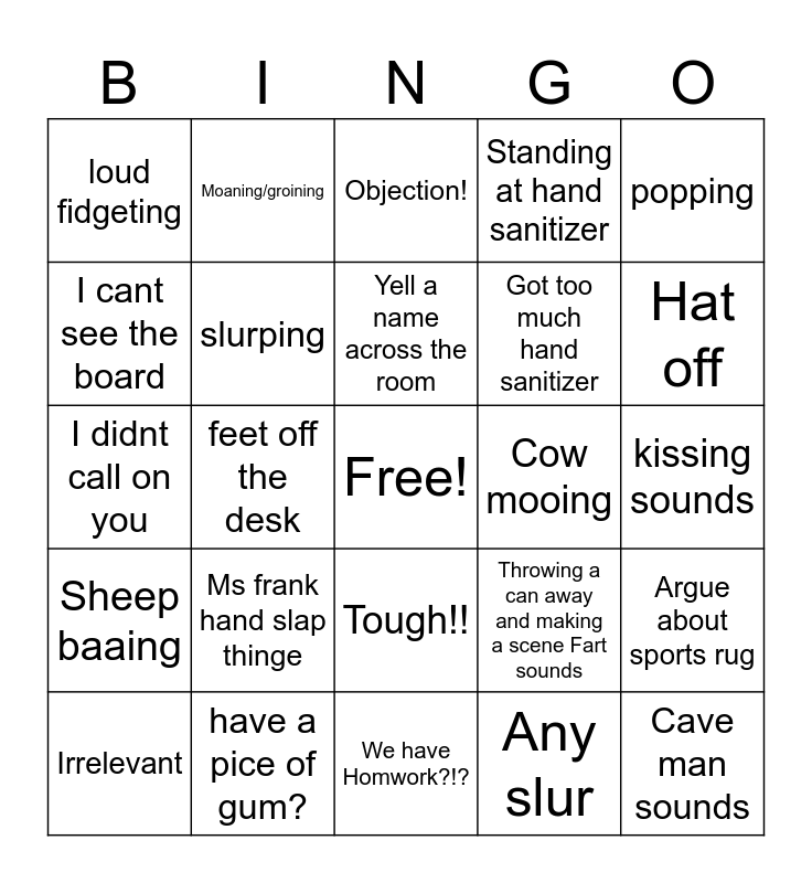 This bingo card has a free space and 43 words: AIGHT!!, Cave man sounds, Dog barking, Irrelevant, Ms frank slamming hand on desk, Any slur, Objection!, Mzz not miss, popping, have a pice of gum?, Standing at hand sanitizer, Cow mooing, Tough!!, Ms frank hand slap thinge, Exercism sounds, We have Homwork?!?, EYP?, I didnt call on you, Prometian board, Hat off, Moaning/groining, EW!!, Picture of ms frank, loud fidgeting, SHHHHH, kissing sounds, Bellwork?!?, Fred and Sally, Throwing a can away and making a scene Fart sounds, Sheep baaing, Cam walking funny, Argue about sports rug, Clicking, feet off the desk, Cam tweaking out, whistling, Who me, Yell a name across the room, I cant see the board, Got too much hand sanitizer, Thrown Object, slurping and Shut up.