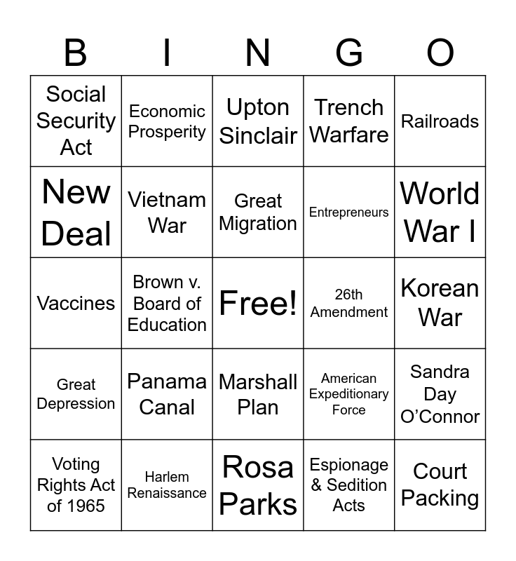 This bingo card has a free space and 104 words: Gilded Age, Electricity, Railroads, Monopoly, Labor Unions, Urbanization, Political Machines, Immigrants, Nativists, Chinese Exclusion Act, Homestead Act, Populist Party, Jane Addams, Jim Crow Laws, WEB DuBois, State Reforms, Upton Sinclair, Pure Food and Drug Act, National Park Service, Improved Working Conditions, 18th Amendment, 19th Amendment, Effects of Spanish American War, Hawaii, Big Stick Policy, Panama Canal, World War I, Trench Warfare, US Enters WWI, WWI Homefront, American Expeditionary Force, Espionage & Sedition Acts, Wilson's 14 Points, Treaty of Versailles, Isolationism, Teapot Dome Scandal, Mass-Manufacturing, Flappers, Great Migration, Harlem Renaissance, Over Speculation, Great Depression, Dust Bowl, New Deal, Federal Deposit Insurance Corporation, Social Security Act, 10th amendment, Court Packing, 22nd Amendment, Pearl Harbor, Justification for War, Victory Gardens, Japanese Internment Camps, Tuskegee Airmen, Navajo Code Talkers, Vernon Baker, Holocaust, Atomic Bomb, Berlin Airlift, Marshall Plan, Korean War, Arms Race, Sputnik, House Un-American Activities Committee, McCarthyism, Suburbs, GI Bill, Economic Prosperity, Vaccines, Brown v. Board of Education, Rosa Parks, MLK, Black Panthers, Little Rock, Arkansas, March on Washington, Civil Rights Act of 1964, Equal Employment Opportunity, Voting Rights Act of 1965, Cuban Missile Crisis, Medicare Act of 1965, Housing and Urban Development Act, Chicano Workers Movement, Vietnam War, Tonkin Resolution, 26th Amendment, Anti-War movement, War Powers Resolution, Environmental Protection Agency, US/China Relations, Watergate, OPEC, Camp David Accords, Iranian Hostage Crisis, Sandra Day O’Connor, Aerospace Technology, Iran-Contra Affair, NAFTA, Entrepreneurs, 2000 Presidential Election, 9/11, Patriot Act, Hurricane Katrina, 2008 Presidential Election and Cultural Diffusion.