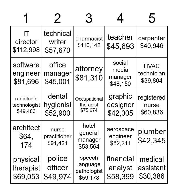 This bingo card has 36 words: accountant $49, 960, operations manager $60,518, human resource manager $64,354, office manager $45,001, aerospace engineer $82,211, architect $64, 174, attorney $81,310, bank teller $23, 979, carpenter $40,946, chemical engineer $72,938, dental hygienist $52,900, teacher $45,693, office administrator $32,995, graphic designer $42,005, HVAC technician $39,804, IT director $112,998, medical assistant $30,386, nurse practitioner $91,421, Occupational therapist $75,674, pharmacist $110,142, registered nurse $60,836, plumber $42,345, police officer $49,974, physical therapist $69,053, speech language pathologist $59,178, technical writer $57,670, radiologic technologist $49,483, retail store manager $45,159, social media manager $48,150, software engineer $81,696, welder $43,126, executive chef $58,108, financial analyst $58,399, hotel general manager $53,564, insurance agent $36,978 and interior designer $45,925.
