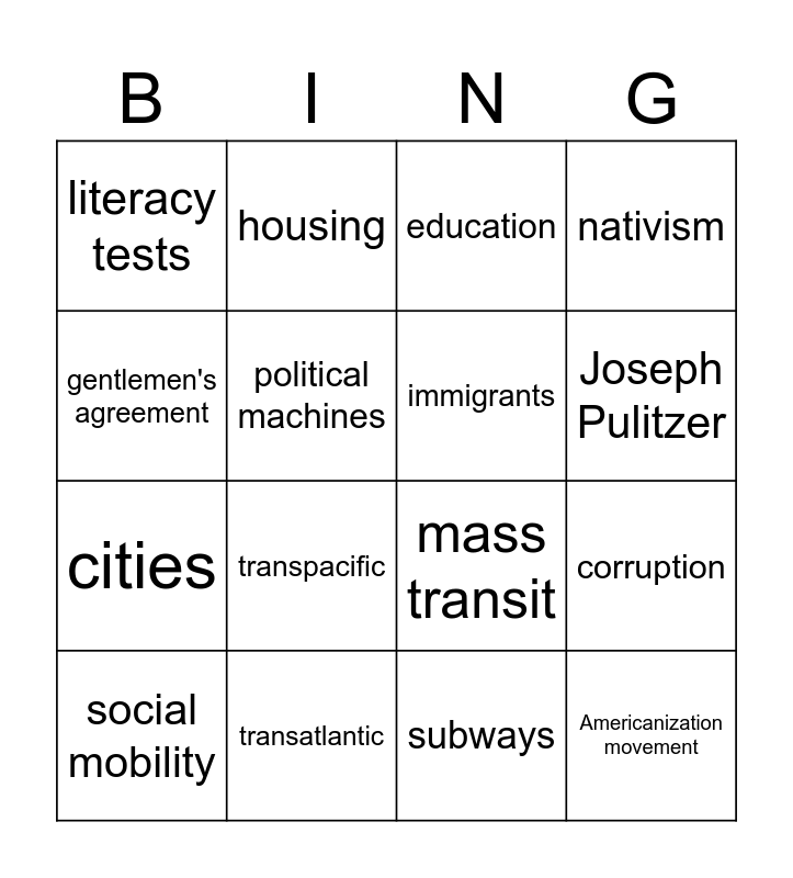 This bingo card has 16 words: transatlantic, corruption, education, literacy tests, cities, housing, mass transit, subways, gentlemen's agreement, political machines, social mobility, nativism, transpacific, Joseph Pulitzer, immigrants and Americanization movement.