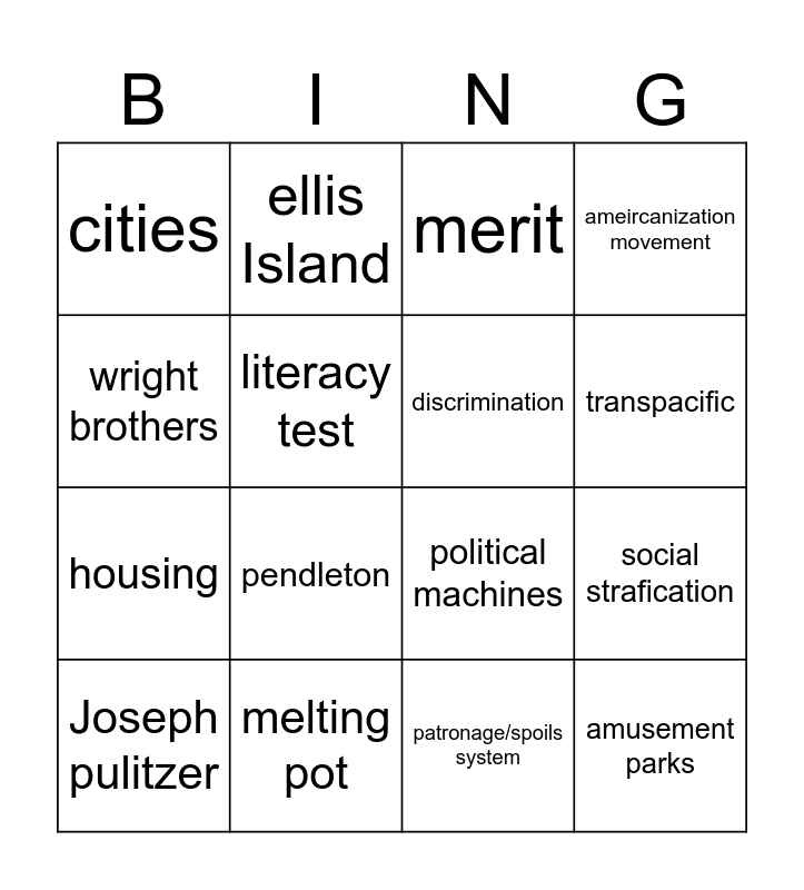 This bingo card has 16 words: melting pot, social strafication, merit, cities, housing, ellis Island, political machines, patronage/spoils system, wright brothers, literacy test, Joseph pulitzer, ameircanization movement, pendleton, transpacific, discrimination and amusement parks.