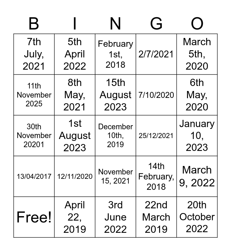 This bingo card has a free space and 24 words: Free!, 12/11/2020, 15th August 2023, 22nd March 2019, March 5th, 2020, 7th July, 2021, 5th April 2022, February 1st, 2018, 25/12/2021, January 10, 2023, 30th November 20201, 8th May, 2021, 14th February, 2018, March 9, 2022, 11th November 2025, April 22, 2019, 3rd June 2022, 2/7/2021, 6th May, 2020, 13/04/2017, 1st August 2023, November 15, 2021, 7/10/2020 and 20th October 2022.