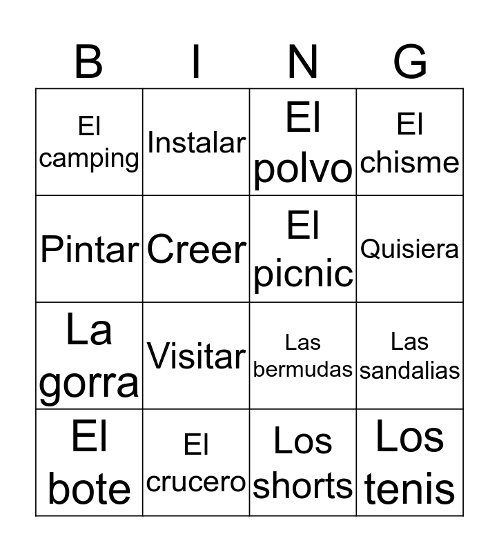 This bingo card has a free space and 15 words: El bote, Los tenis, El polvo, El camping, Quisiera, Pintar, Visitar, Los shorts, Creer, La gorra, Las sandalias, El chisme, El picnic, Instalar and El crucero.