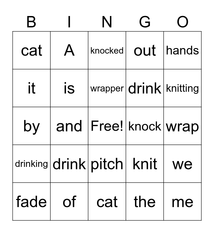 This bingo card has a free space and 24 words: fade, drink, wrapper, the, hands, cat, A, knocked, knock, wrap, by, is, knit, we, it, of, cat, out, knitting, drinking, and, pitch, drink and me.