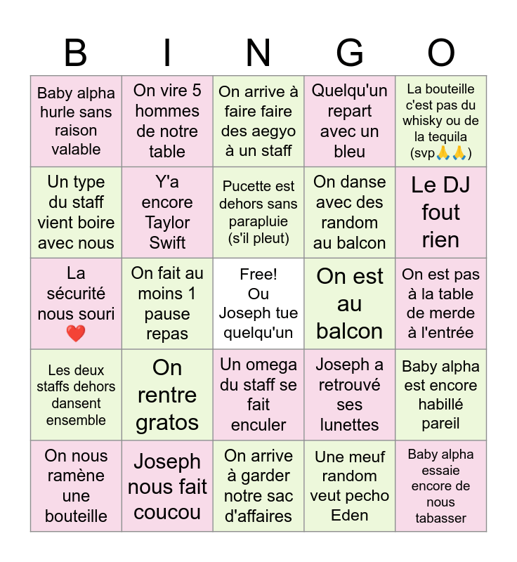 This bingo card has a free space and 24 words: On rentre gratos, Joseph nous fait coucou, Pucette est dehors sans parapluie (s'il pleut), On nous ramène une bouteille, La bouteille c'est pas du whisky ou de la tequila (svp🙏🙏), Baby alpha hurle sans raison valable, Un type du staff vient boire avec nous, On vire 5 hommes de notre table, On est au balcon, Un omega du staff se fait enculer, On danse avec des random au balcon, La sécurité nous souri ❤️, Joseph a retrouvé ses lunettes, Baby alpha est encore habillé pareil, Y'a encore Taylor Swift, Une meuf random veut pecho Eden, On est pas à la table de merde à l'entrée, On arrive à faire faire des aegyo à un staff, Le DJ fout rien, On fait au moins 1 pause repas, Baby alpha essaie encore de nous tabasser, Les deux staffs dehors dansent ensemble, Quelqu'un repart avec un bleu and On arrive à garder notre sac d'affaires.