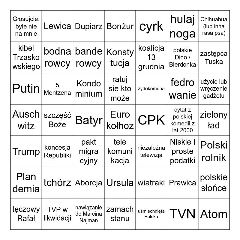 This bingo card has 49 words: Prawica, polskie Dino / Bierdonka, uśmiechnięta Polska, szczęść Boże, Kondo minium, zielony ład, Lewica, nawiązanie do Marcina Najman, hulaj noga, tele komuni kacja, Chihuahua (lub inna rasa psa), Bonżur, fedro wanie, żydokomuna, tchórz, cytat z polskiej komedii z lat 2000, kibel Trzasko wskiego, zastępca Tuska, polskie słońce, cyrk, koalicja 13 grudnia, Batyr, Głosujcie, byle nie na mnie, bodna rowcy, tęczowy Rafał, bande rowcy, użycie lub wręczenie gadżetu, TVP w likwidacji, ratuj sie kto może, 5 Mentzena, Atom, CPK, Plan demia, Aborcja, Ausch witz, niezależna telewizja, Niskie i proste podatki, Polski rolnik, Putin, pakt migra cyjny, Ursula, Trump, Euro kołhoz, zamach stanu, Konsty tucja, Dupiarz, wiatraki, koncesja Republiki and TVN.