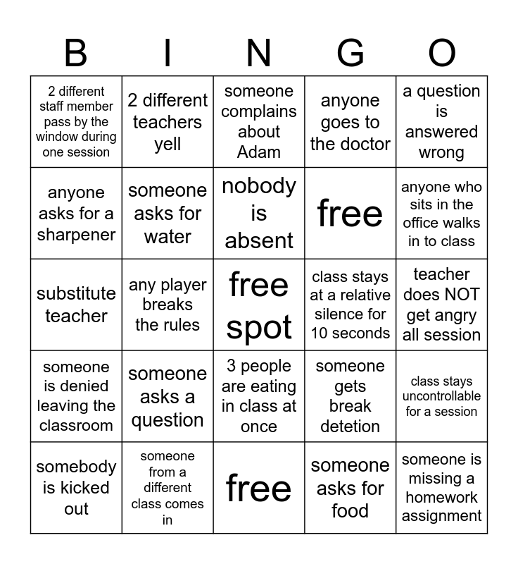 This bingo card has a free space and 24 words: someone asks a question, someone from a different class comes in, nobody is absent, somebody is kicked out, a question is answered wrong, 2 different staff member pass by the window during one session, anyone asks for a sharpener, 2 different teachers yell, class stays at a relative silence for 10 seconds, 3 people are eating in class at once, free, substitute teacher, someone gets break detetion, class stays uncontrollable for a session, someone asks for water, someone asks for food, teacher does NOT get angry all session, someone complains about Adam, anyone who sits in the office walks in to class, any player breaks the rules, someone is missing a homework assignment, someone is denied leaving the classroom, anyone goes to the doctor and free.