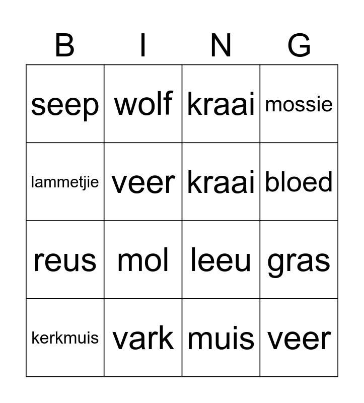 This bingo card has 16 words: vark, gras, kraai, seep, reus, wolf, leeu, muis, lammetjie, veer, kerkmuis, mossie, mol, bloed, kraai and veer.
