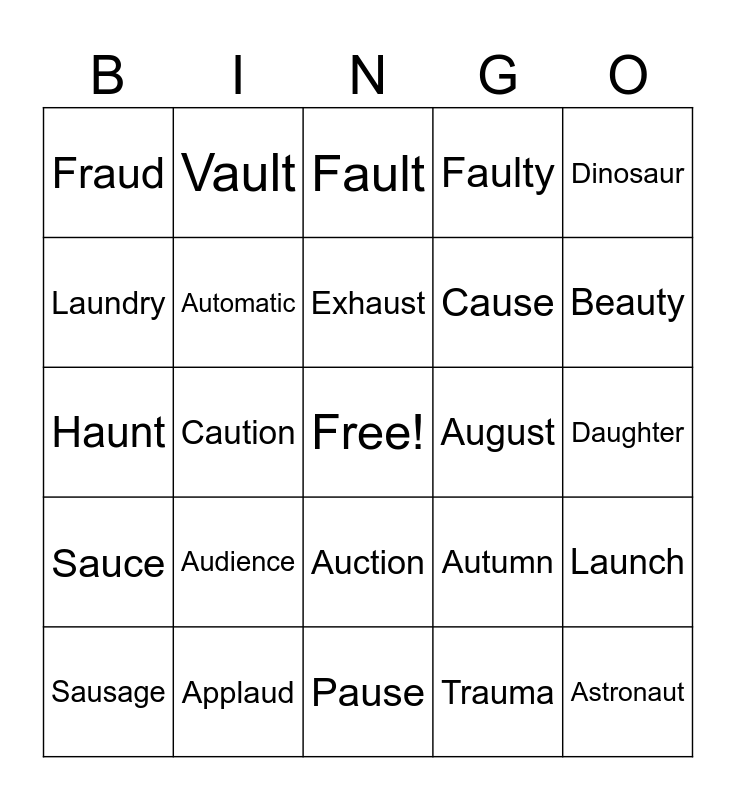 This bingo card has a free space and 27 words: Autumn, Author, Cause, Pause, Laundry, Fault, Vault, Sauce, August, Launch, Haunt, Faulty, Sausage, Applaud, Beauty, Taught, Automatic, Exhaust, Audience, Fraud, Daughter, Trauma, Caution, Astronaut, Auction, Dinosaur and Auditorium.