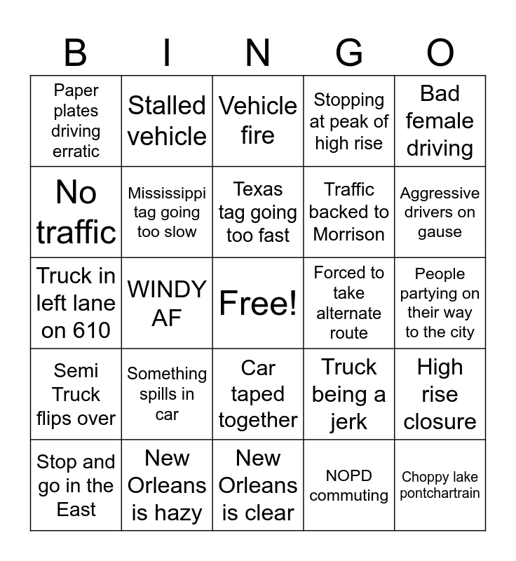 This bingo card has a free space and 28 words: High rise closure, Fog, Traffic backed to Morrison, NOPD commuting, No traffic, Vehicle fire, Stalled vehicle, Semi Truck flips over, Forced to take alternate route, Stop and go in the East, Truck in left lane on 610, Stopping at peak of high rise, New Orleans is hazy, New Orleans is clear, Aggressive drivers on gause, Debris in road, Something spills in car, Mississippi tag going too slow, Texas tag going too fast, Car taped together, Paper plates driving erratic, Marsh Fire, Choppy lake pontchartrain, WINDY AF, People partying on their way to the city, Truck being a jerk, Bad female driving and Someone texting & driving.
