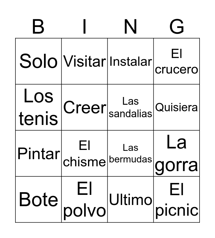 This bingo card has a free space and 15 words: Bote, El picnic, Instalar, Solo, Quisiera, Los tenis, El chisme, Ultimo, Creer, Pintar, La gorra, El crucero, Las sandalias, Visitar and El polvo.