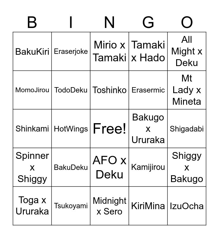 This bingo card has a free space and 24 words: BakuDeku, Tsukoyami, Toshinko, Toga x Ururaka, All Might x Deku, BakuKiri, MomoJirou, Eraserjoke, Bakugo x Ururaka, AFO x Deku, Erasermic, Shinkami, Kamijirou, Shiggy x Bakugo, TodoDeku, KiriMina, Shigadabi, Mirio x Tamaki, Mt Lady x Mineta, HotWings, IzuOcha, Spinner x Shiggy, Tamaki x Hado and Midnight x Sero.