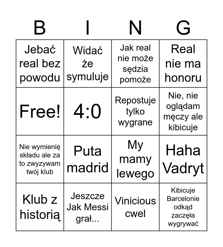 This bingo card has 16 words: Jeszcze Jak Messi grał..., Haha Vadryt, Jak real nie może sędzia pomoże, Jebać real bez powodu, Nie wymienię składu ale za to zwyzywam twój klub, Widać że symuluje, My mamy lewego, Vinicious cwel, Free!, 4:0, Klub z historią, Real nie ma honoru, Puta madrid, Nie, nie oglądam męczy ale kibicuje, Repostuje tylko wygrane and Kibicuje Barcelonie odkąd zaczęła wygrywać.