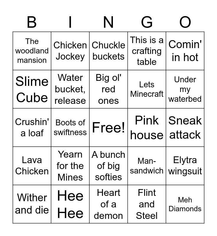 This bingo card has a free space and 32 words: Flint and Steel, Diamond armor, Full set, Boots of swiftness, The nether, Lava Chicken, Water bucket, release, Comin' in hot, Elytra wingsuit, Chicken Jockey, These are the villagers, Big ol' red ones, Chuckle buckets, Weapons for days, I, am Steve, Pink house, This is an Ender Pearl, Wither and die, Crushin' a loaf, A bunch of big softies, Yearn for the Mines, Man-sandwich, Protein pronto, Sneak attack, Hee Hee, Meh Diamonds, This is a crafting table, Lets Minecraft, Slime Cube, The woodland mansion, Heart of a demon, Sadistic Fight club and Under my waterbed.