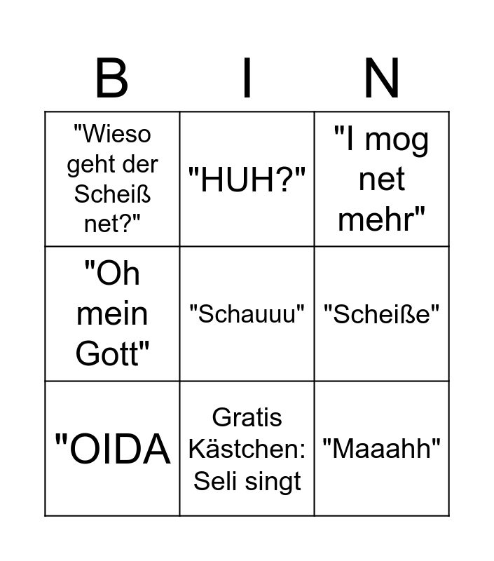 This bingo card has a free space and 8 words: "Scheiße", "I mog net mehr", "HUH?", "OIDA, "Wieso geht der Scheiß net?", "Maaahh", "Oh mein Gott" and Gratis Kästchen: Seli singt.