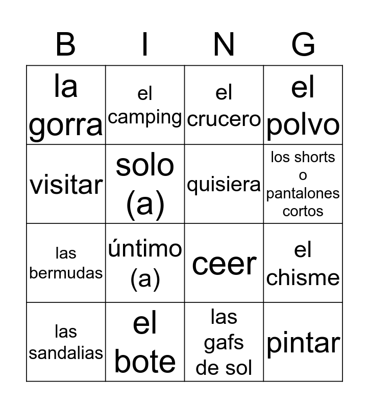 This bingo card has 16 words: el bote, el chisme, el crucero, la gorra, las bermudas, el camping, ceer, las gafs de sol, visitar, solo (a), las sandalias, el polvo, úntimo (a), los shorts o pantalones cortos, quisiera and pintar.