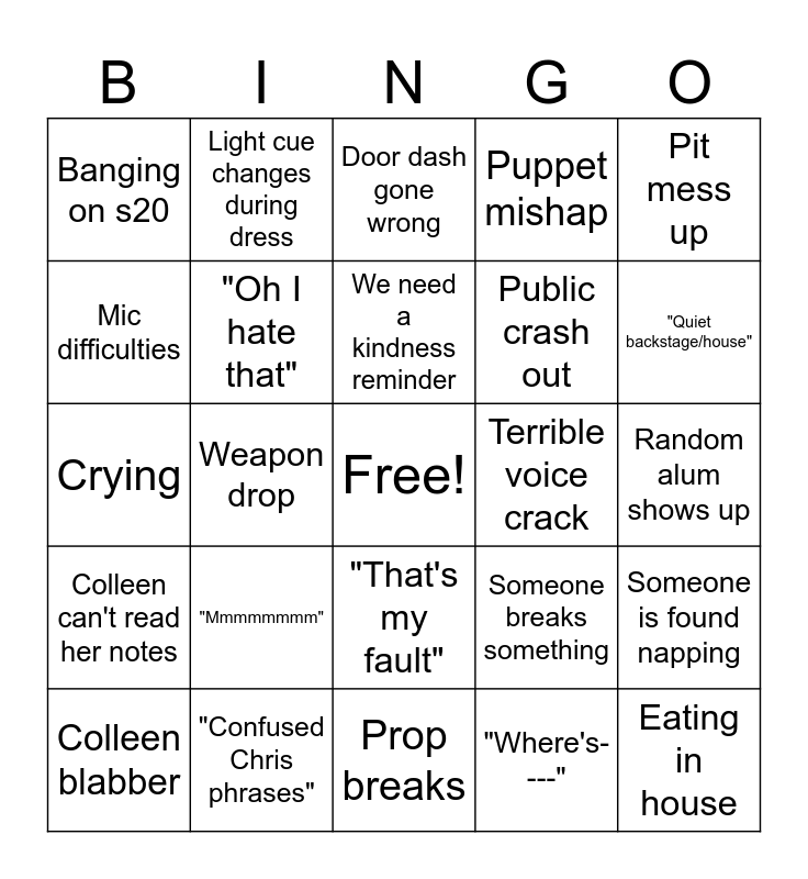 This bingo card has a free space and 29 words: Colleen blabber, Messer blabber, Weapon drop, Deck is early/late, Banging on s20, Door dash gone wrong, "Oh I hate that", "Mmmmmmmm", Terrible voice crack, "Confused Chris phrases", Random alum shows up, Eating in house, Prop breaks, "Where's----", "Quiet backstage/house", "Where are we", "That's my fault", Colleen can't read her notes, Pit mess up, Crying, Someone breaks something, "Guys lock in", Public crash out, Mic difficulties, Puppet mishap, Light cue changes during dress, Someone is found napping, We need a kindness reminder and Lore change.