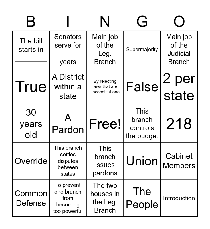 This bingo card has a free space and 43 words: Living Document, Introduction, General Welfare, Common Defense, Posterity, The People, Main job of the Leg. Branch, Main job of the Executive Branch, Main job of the Judicial Branch, To prevent one branch from becoming too powerful, Supermajority, This branch controls the budget, This branch issues pardons, This branch settles disputes between states, Bicameral means:, The two houses in the Leg. Branch, 25 years old, 30 years old, Population, 2 per state, Senators serve for ____ years, Representatives serve for ____ years, Step 1 of a bill becoming a law, The bill starts in ________, 50% or more, 218, The Vice President, Veto, Union, Override, Framers, Cabinet Members, The Chief of our military., A Pardon, Impeachment, By Overriding Vetoes, By Nominating Supreme Court Justices, By rejecting laws that are Unconstitutional, True, False, The President signs the bill into law, A District within a state and The whole state.