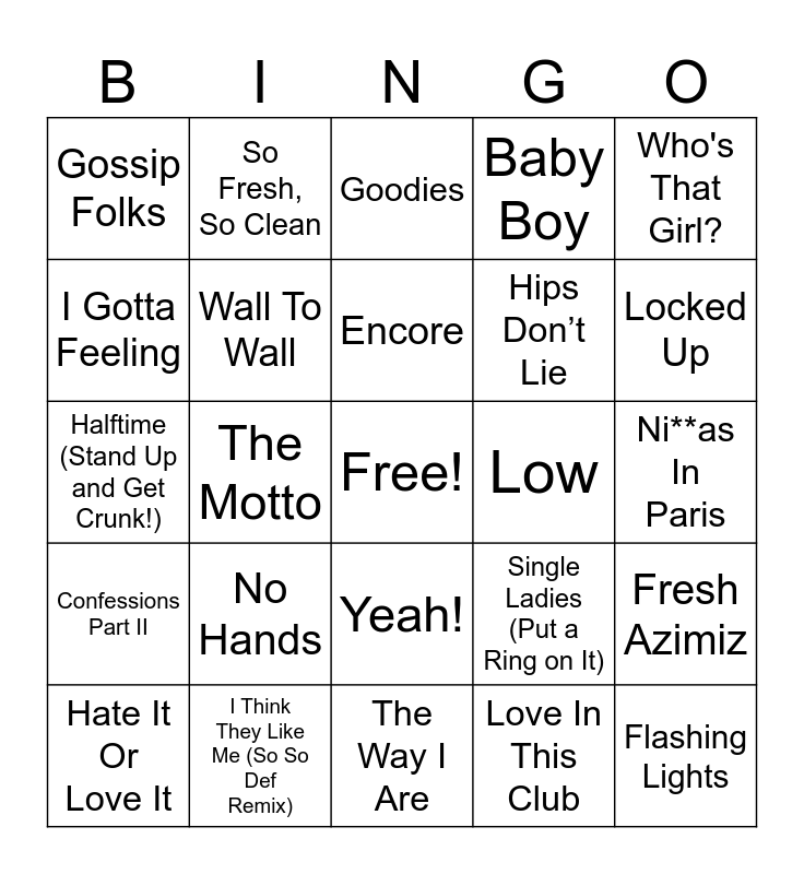 This bingo card has a free space and 40 words: Get Back, Halftime (Stand Up and Get Crunk!), Get Like Me, Wall To Wall, I Think They Like Me (So So Def Remix), Yeah!, Encore, Dirt Off Your Shoulder, Who's That Girl?, Confessions Part II, The Motto, Baby Boy, Flashing Lights, Ni**as In Paris, Low, No Hands, Lose Control, Gossip Folks, You Don’t Know, Goodies, Fresh Azimiz, Love In This Club, Hips Don’t Lie, I Gotta Feeling, SexyBack, My Name Is, The Way You Move, Love Don’t Cost a Thing, Always On Time, Promiscuous, Beautiful, Hate It Or Love It, Oh Boy, Single Ladies (Put a Ring on It), Locked Up, The Way I Are, Just A Lil Bit, Lose Yourself, So Fresh, So Clean and Southern Hospitality.