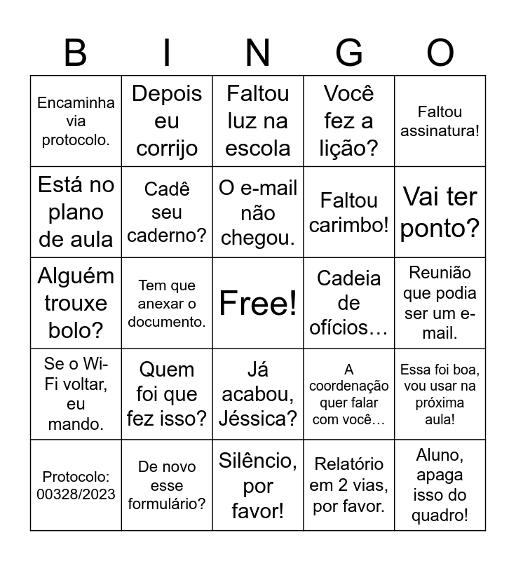 This bingo card has a free space and 46 words: Corrigindo prova até meia-noite, Aluno, apaga isso do quadro!, Cadê o giz?, Silêncio, por favor!, Quem foi que fez isso?, Todo mundo entendeu?, Depois eu corrijo, Esse conteúdo cai na prova!, Está no plano de aula, Amanhã tem reunião, Cadê seu caderno?, Você fez a lição?, Essa foi boa, vou usar na próxima aula!, A coordenação quer falar com você…, Vamos fazer uma dinâmica!, Travou o sistema!, O e-mail não chegou., Cadeia de ofícios…, Deu erro no SED., Faltou assinatura!, Tem que anexar o documento., Relatório em 2 vias, por favor., Encaminha via protocolo., Faltou carimbo!, Está com a supervisão., Vai ter ponto?, Protocolo: 00328/2023, Hoje tem café coletivo!, Já acabou, Jéssica?, Se o Wi-Fi voltar, eu mando., Só mais cinco minutinhos!, Chama o suporte técnico!, É pra ontem., Copia e cola, mas muda umas palavras., Não tenho esse arquivo salvo., De novo esse formulário?, Reunião que podia ser um e-mail., Coloca no grupo., Essa impressora odeia a gente, Turma de energia elevada hoje, Achei que era online, Faltou luz na escola, Alguém trouxe bolo?, Hoje é dia de roupa pedagógica, Leu e não respondeu and Esqueci o crachá de novo!.