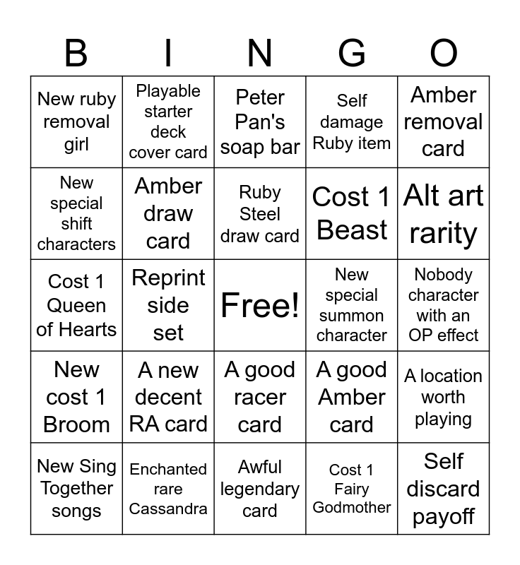 This bingo card has a free space and 24 words: A new decent RA card, Enchanted rare Cassandra, Ruby Steel draw card, New Sing Together songs, Amber removal card, New ruby removal girl, New special shift characters, Playable starter deck cover card, New special summon character, A good racer card, Cost 1 Beast, Cost 1 Queen of Hearts, A good Amber card, A location worth playing, Amber draw card, Cost 1 Fairy Godmother, Nobody character with an OP effect, Peter Pan's soap bar, Alt art rarity, Reprint side set, Self discard payoff, New cost 1 Broom, Self damage Ruby item and Awful legendary card.