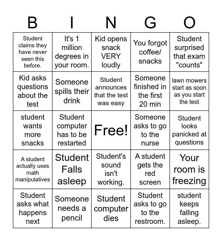 This bingo card has a free space and 24 words: Student Falls asleep, Someone needs a pencil, Student announces that the test was easy, Student asks what happens next, Student surprised that exam "counts", Student claims they have never seen this before., Kid asks questions about the test, It's 1 million degrees in your room., Someone asks to go to the nurse, Student's sound isn't working., Someone finished in the first 20 min, student wants more snacks, A student gets the red screen, Your room is freezing, Someone spills their drink, Student asks to go to the restroom., Student looks panicked at questions, Kid opens snack VERY loudly, lawn mowers start as soon as you start the test, Student computer has to be restarted, student keeps falling asleep., A student actually uses math manipulatives, You forgot coffee/ snacks and Student computer dies.