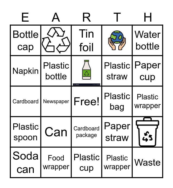 This bingo card has 5 images, a free space and 24 words: Soda can, Garbage, Newspaper, Garbage, Bottle cap, Tin foil, Plastic bottle, Can, Plastic bag, Food wrapper, Plastic wrapper, Waste, Plastic cup, Plastic wrapper, Paper cup, Wood spoon, Cardboard package, Plastic spoon, Water bottle, Cardboard, Paper straw, Recycling, Plastic straw and Napkin.